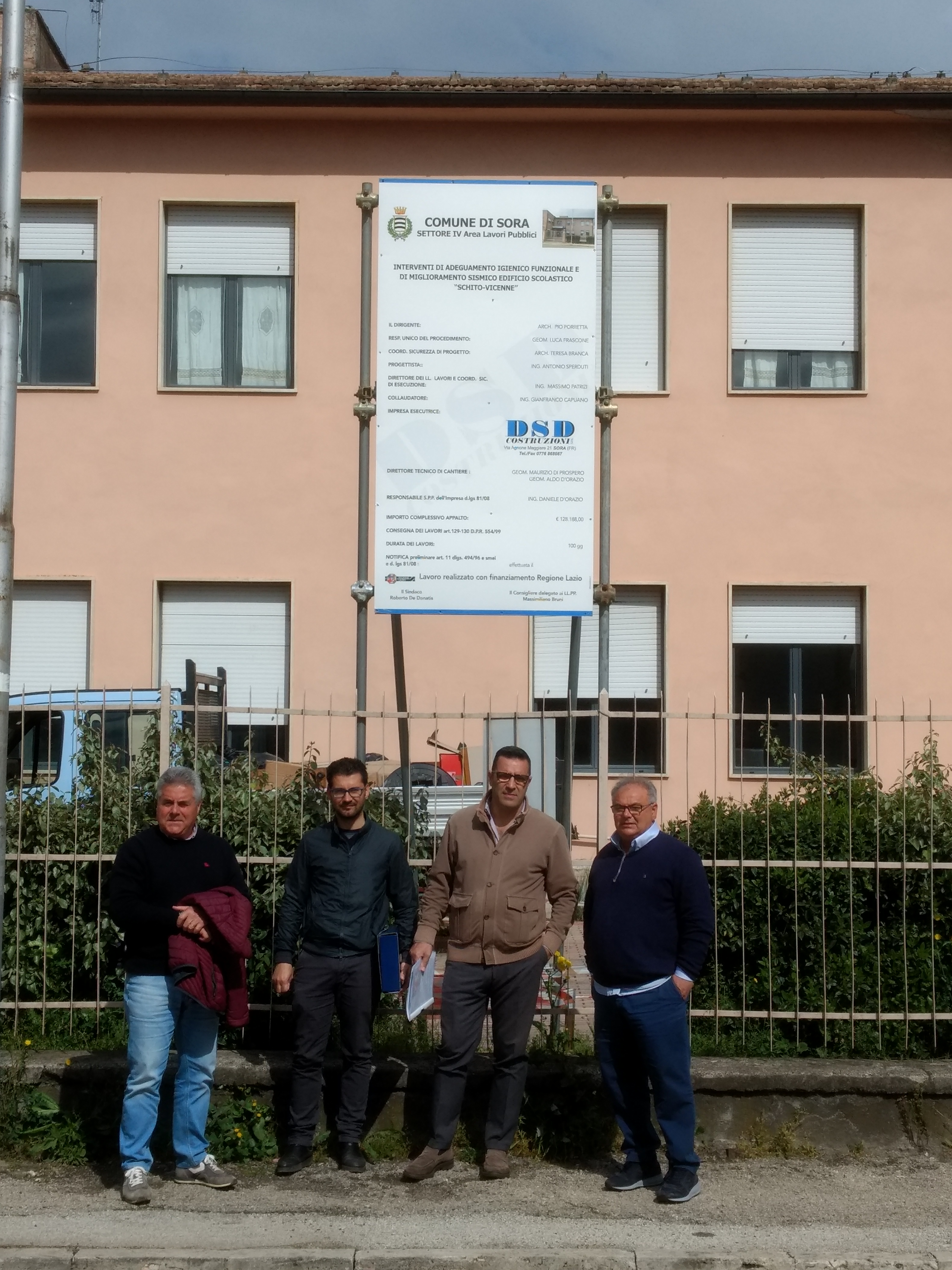 Il Comune di Sora ha consegnato, stamani, i lavori per l’adeguamento sismico dell’edificio scolastico Schito-Vicenne. Lo annunciano il Sindaco Roberto De Donatis e il Consigliere delegato ai Lavori Pubblici Massimiliano Bruni. I lavori, per un importo di 93.036,60 euro, saranno svolti dalla ditta “DSD Costruzioni”, sotto la direzione dell’Ing. Massimo Patrizi. Il Rup è il Geom. Luca Frascone.