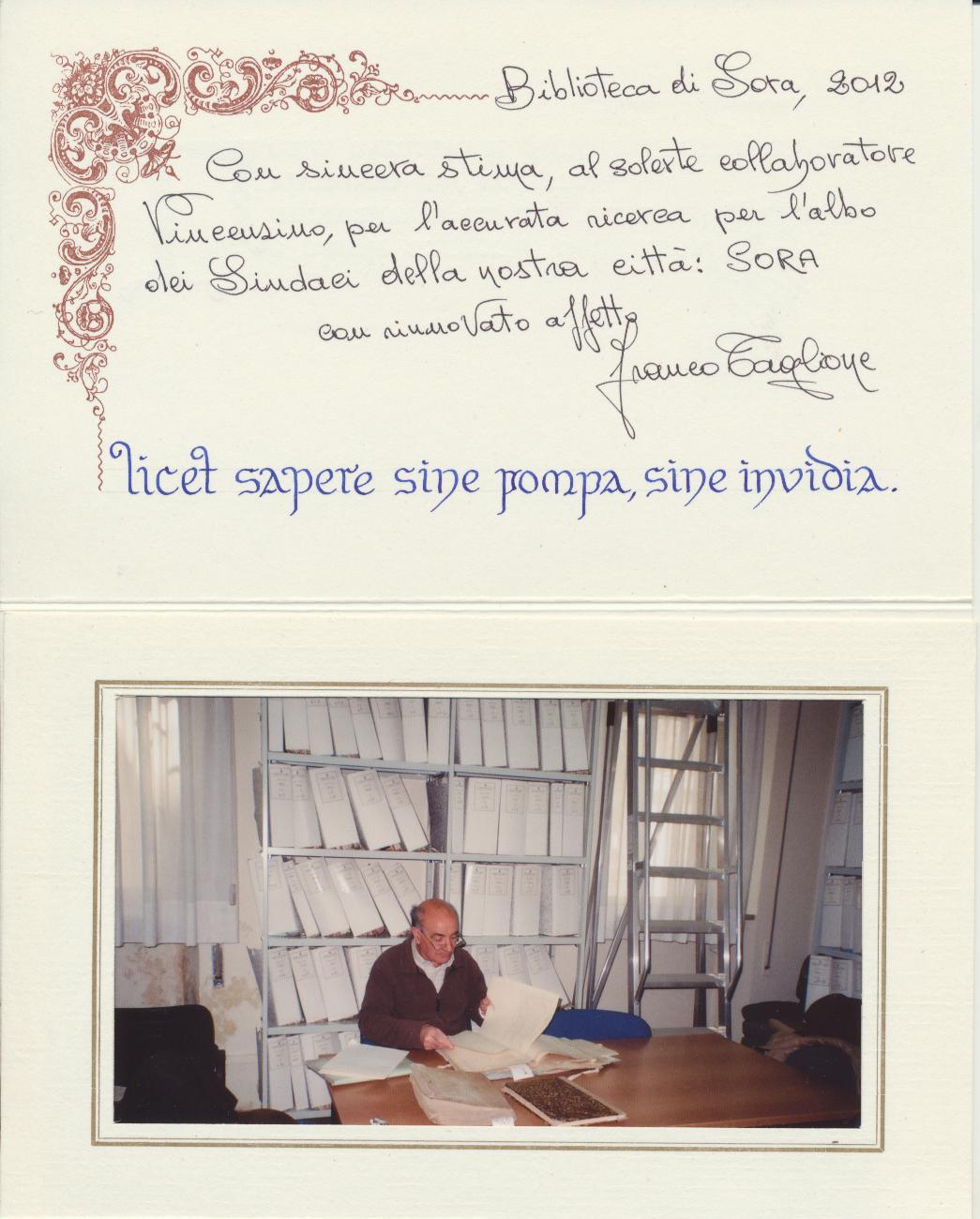 Un grazie anche a Maria Rosaria Tollis per la collaborazione. Da questa ricerca è nata l’idea di stilare l’Albo dei Sindaci, realizzato con maestria da Franco Taglione. Ancora una volta, quindi, il contributo di questo studioso si è rilevato indispensabile come già è accaduto nel passato. Vincenzino Alonzi ha, infatti, collaborato alle ricerche storiche di numerose pubblicazioni tra le quali ricordiamo “Il culto della Madonna e dei Santi nella Città di Sora” a cura del Lucio Meglio e Romina Rea, “Le chiese della natività a Sora” di Alessandra Tanzilli, “Francescantonio Biancale e Sora” di Bruno La Pietra ” e “Ricordando Alberto La Rocca” di Rossana Gemmiti”.