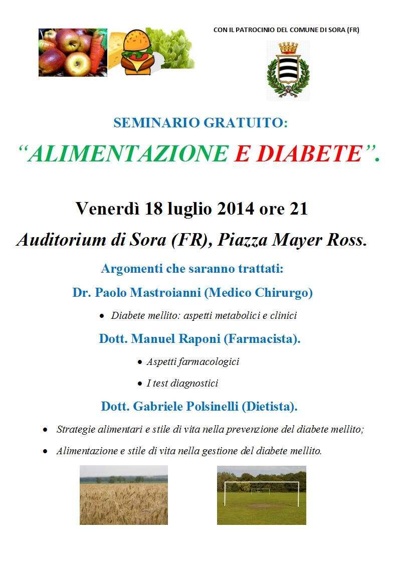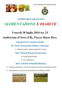 Seminario Alimentazione e Diabete Sora 2014 LocandinaVenerdì 18 luglio 2014, alle ore 21, presso l’Auditorium “V. De Sica”, in Piazza Mayer Ross, si terrà il SEMINARIO GRATUITO sul tema “ALIMENTAZIONE E DIABETE”. Saranno trattati i seguenti argomenti: