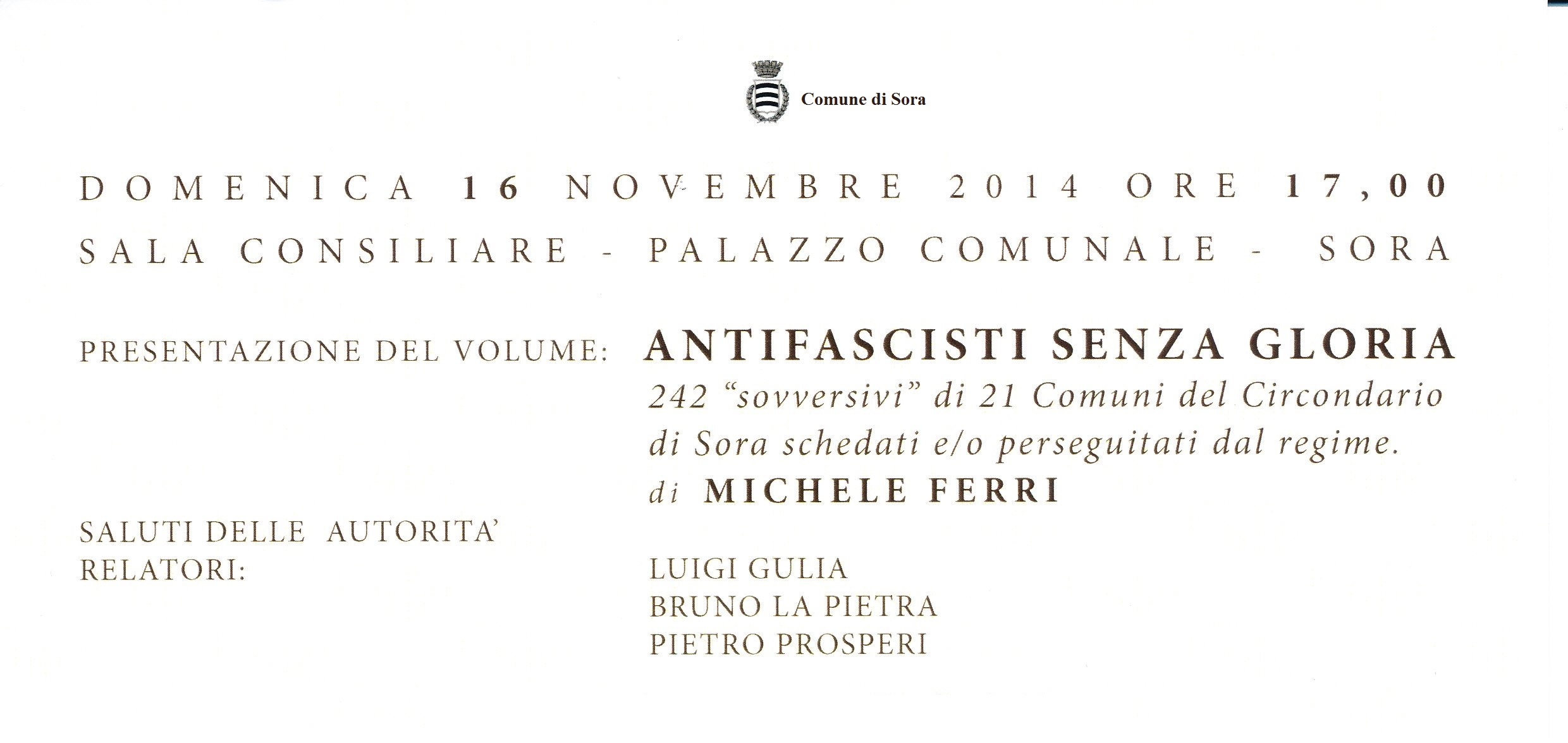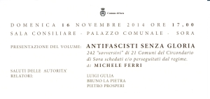 invitopresentazioneLibroProfF.erriDomenica 16 novembre 2014, alle ore 17.00, nella Sala Consiliare del Comune di Sora, verrà presentato il volume del Prof. Michele Ferri “ANTIFASCISTI SENZA GLORIA: duecentoquarantadue “sovversivi“ di ventuno Comuni del Circondario di Sora schedati e/o perseguitati dal regime”.