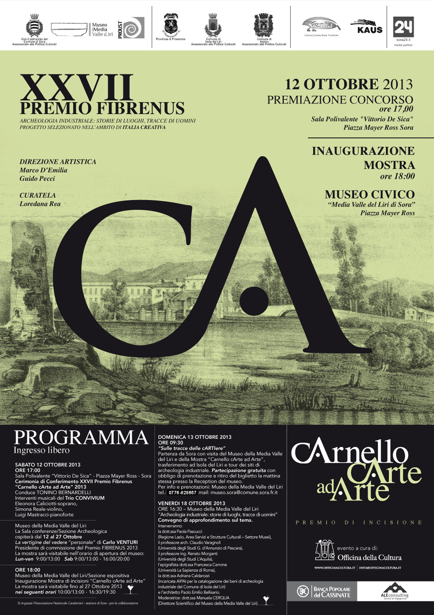 POSTER a coloriDal 12 al 27 ottobre 2013 si terrà la XXVII edizione del Premio Fibrenus, la X nella formula “Carnello cARTE ad Arte”, che quest’anno torna arricchito di appuntamenti, inediti e di alto profilo culturale, a cura dell’Officina della Cultura in collaborazione con il Museo della Media Valle del Liri.