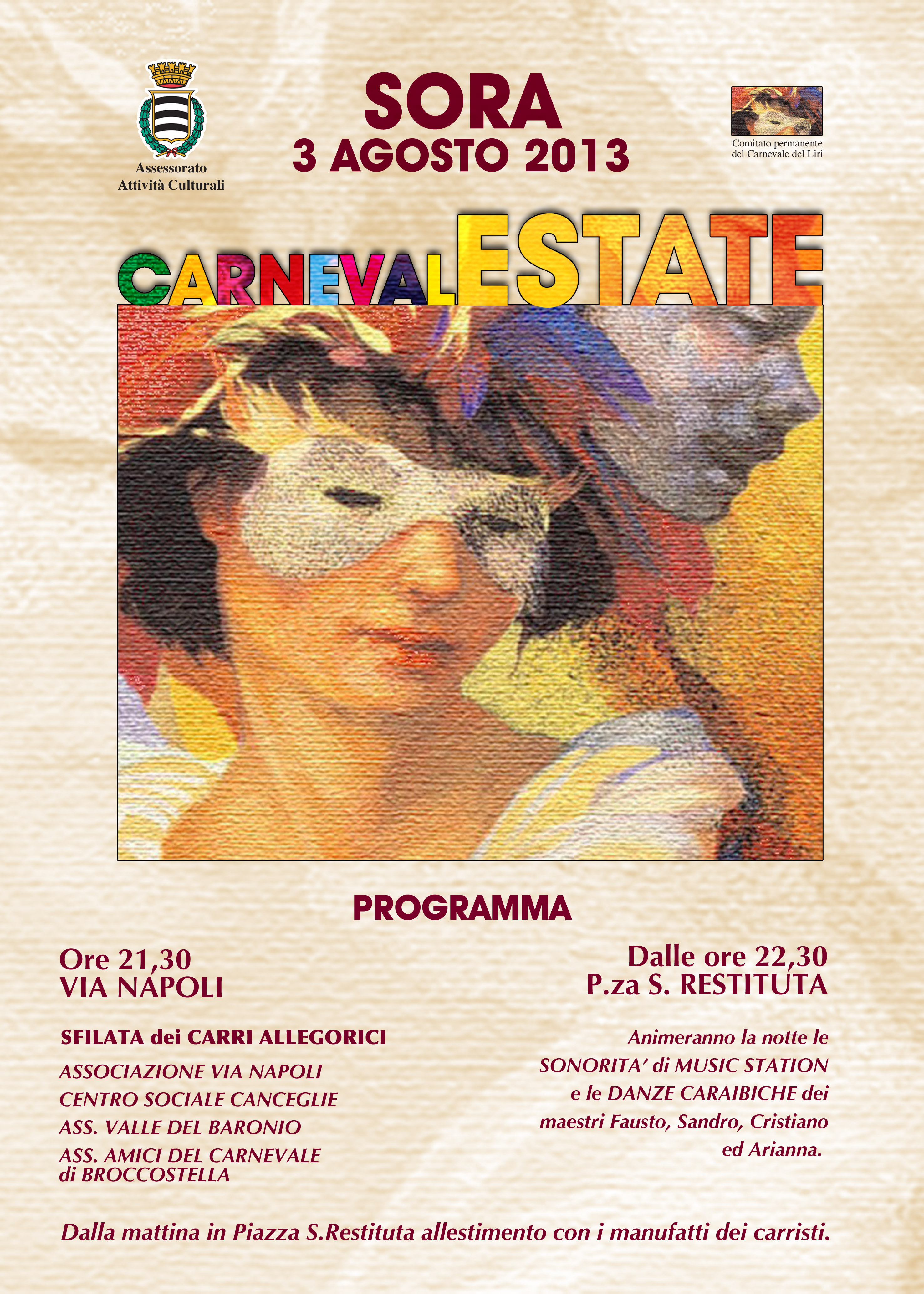 ““Vorrei ribadire come, dopo una serie di difficoltà, gli eventi sismici dello scorso febbraio e il maltempo che ha interessato il nostro territorio fino a qualche settimana fa, siamo finalmente giunti a questa edizione del Carnevale – ha evidenziato il Presidente del Comitato Permanente del Carnevale del Liri Anna Maria Giordano. – Il programma prevede una mostra allestita in P.zza S. Restituta di manufatti delle passate edizioni del carnevale. La tradizionale sfilata dei carri allegorici con partenza da Via Napoli alle ore 21.30 di sabato 3 agosto, proseguirà sul lungoliri Simoncelli, Ponte di Ferro, Via Deci, Corso Volsci, fino a raggiungere P.zza S. Restituta. A capeggiare la sfilata un particolare carro: Alessandro Spaziani e la sua Music Station, animeranno il percorso con i loro cavalli di battaglia, continuando a suonare per tutta la serata in Piazza S. Restituta. Nella cornice di questa splendida piazza avrà luogo uno spettacolo a cura di alcuni maestri di ballo: una decina di ballerini eseguiranno bellissime “figure” lasciandosi guidare da brani famosi. Seguiranno balli caraibici e no n per coinvolgere tutto il pubblico. Vera novità di questa edizione estiva sarà una particolare esibizione di Raffaele Gliottone e di Rodolfo Damiani che vestirà i panni di “Rigoletto”.Colgo l’occasione per ringraziare tutte le associazioni che con gran spirito di sacrificio hanno realizzato le allegorie e in questa settimana stanno lavorando per illuminare i carri, ringrazio le forze dell’ordine nella persona del cap. Dei Cicchi che garantirà la sicurezza e l’incolumità di tutto il pubblico e mi preme ringraziare il Sig. Franco Rea per l’ospitalità che ci concede dal mese di febbraio per la realizzazione e la protezione dei carri. Colgo inoltre l’occasione per chiedere all’ Assessore Petricca affinché si adoperi per dare una sede fissa al nostro Carnevale”