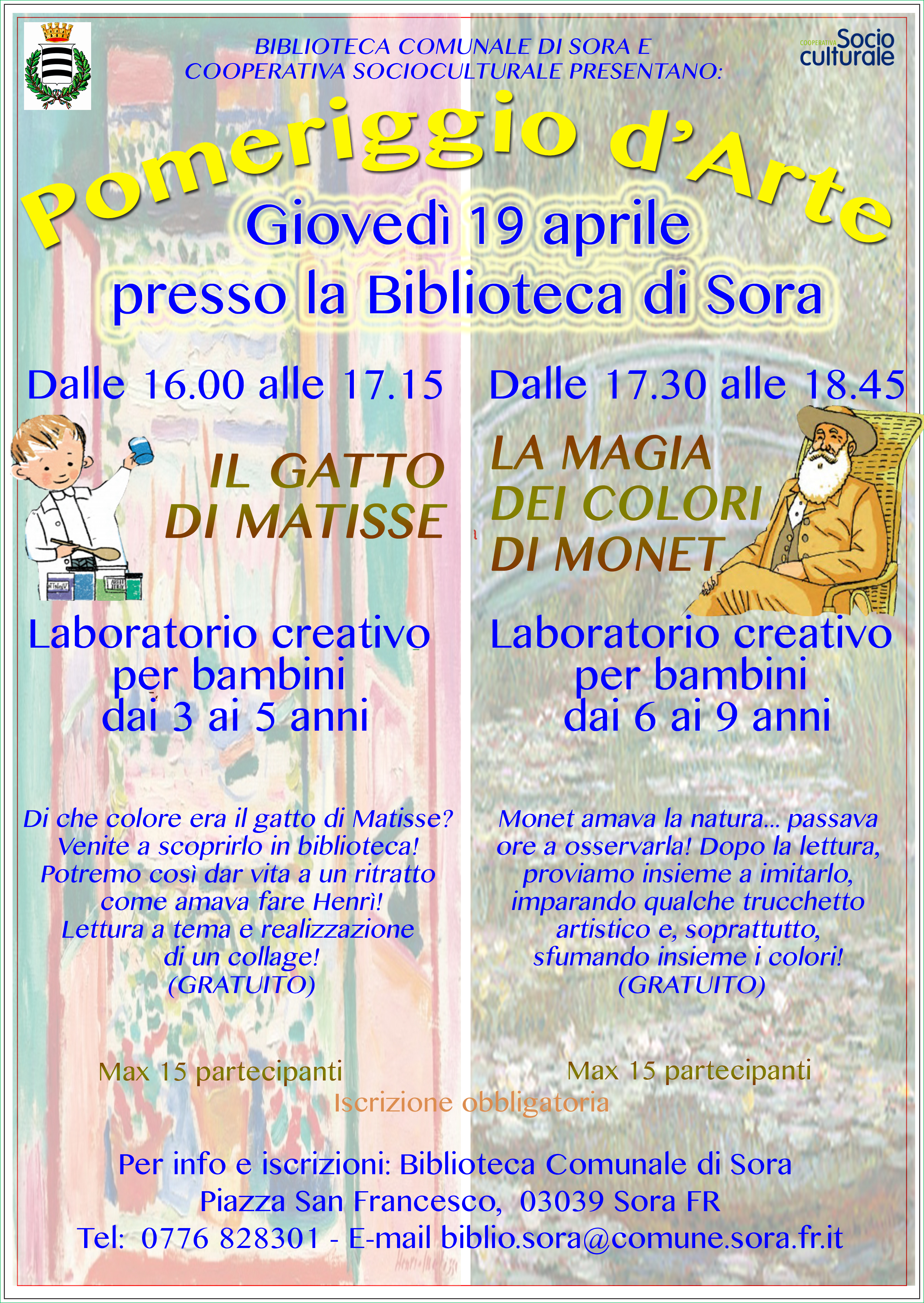 I laboratori sono gratuiti ma è obbligatoria l’iscrizione. Per informazioni e prenotazioni rivolgersi alla Biblioteca Comunale, in Piazza S. Francesco, tel. 0776828301 – e-mail biblio.sora@comune.sora.fr.it.
