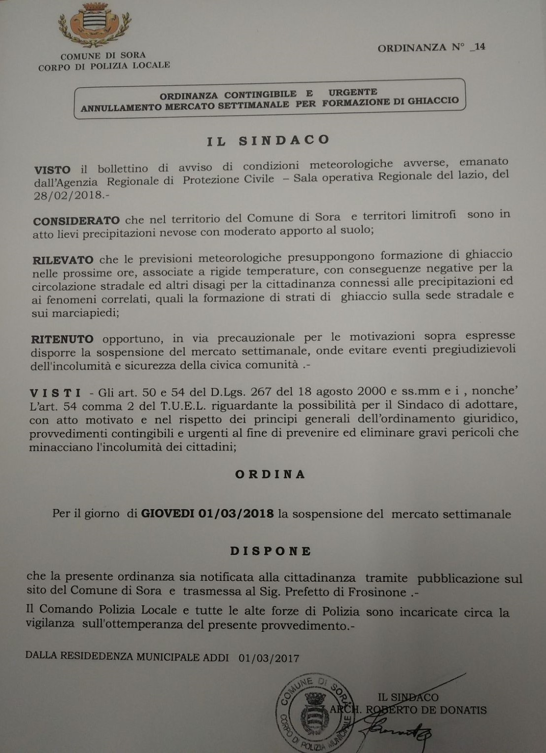 In base all’attuale situazione meteorologica, con Ordinanza 14 del 1° marzo 2018, il Sindaco Roberto De Donatis ha disposto unicamente la sospensione del mercato settimanale del giovedì. Oggi le scuole resteranno aperte, salvo ulteriori decisioni.