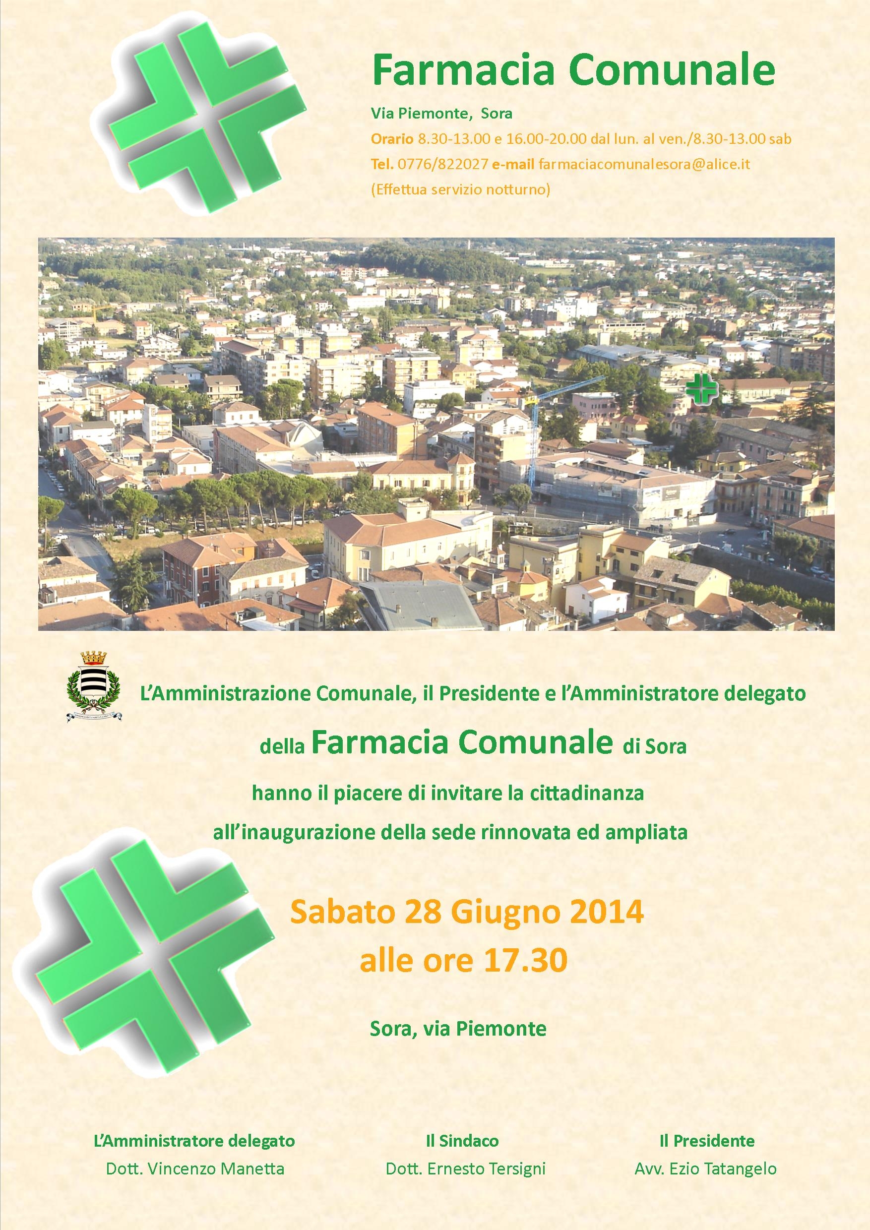 Nuovo look per la Farmacia Comunale di Sora. Sabato 28 giugno 2014, alle ore 17.30, si terrà la cerimonia di inaugurazione della sede rinnovata ed ampliata, sita in Via Piemonte. Il Sindaco Ernesto Tersigni, il Presidente della Farmacia Comunale Avv. Ezio Tatangelo e l’Amministratore Delegato Dott. Vincenzo Manetta invitano le autorità e la cittadinanza ad intervenire all’evento.