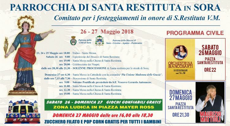 E’ stato reso noto il programma ufficiale dei festeggiamenti in onore di Santa Restituta, Patrona della città di Sora e della Diocesi di Sora, Cassino, Aquino, Pontecorvo. Saranno cinque giorni di intense e varie iniziative che riusciranno a soddisfare piccoli e grandi. Intanto sarà anche l’occasione per significativi momenti di preghiera e di riflessione. Il rinnovato Comitato organizzatore ha lavorato con serietà ed impegno. Il tradizionale triduo, con la S. Messa, si terrà nei giorni 23, 24 e 25 maggio con inizio alle ore 18.00.