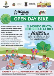 Gli eventi in programma prenderanno il via con l’OPEN DAY BIKE – Il mondo ruota intorno alla bici! L’appuntamento è per domenica 11 febbraio 2018, presso il “Parco Famiglia La Posta”, alle ore 9:00. Ci saranno partenze di gruppo in Mountain Bike, Bici da strada, Enduro. Tanti spazi per i bambini, con l’allestimento all’interno del parco di un percorso ciclabile tutto per loro.
