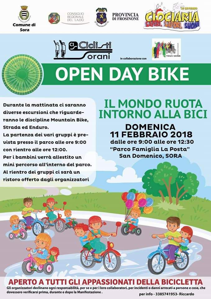 DOMENICA 11 FEBBRAIO 2018: “OPEN DAY BIKE: IL MONDO RUOTA INTORNO ALLA BICI”, giornata dedicata al mezzo della bicicletta, nell’ambito del progetto promosso dalla provincia, “Ciociaria: Saperi, Sapori, e Suoni di Inverno”. L’evento si svolge presso il “Parco Famiglia La Posta” a San Domenico, e vedrà l’organizzazione di partenze a gruppo a seconda di diversi ambiti della bicicletta, con l’allestimento di stand gastronomici in collaborazione con l’associazione Tofaro Insieme.