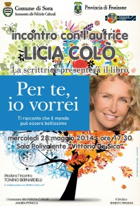 Mercoledì 28 maggio 2014, alle ore 17.30, presso la Sala Polivalente “Vittorio De Sica”, in Piazza Mayer Ross, la famosa conduttrice ed animalista Licia Colò presenterà al pubblico il suo libro “Per te, io vorrei”. Con tale iniziativa il Comune di Sora aderisce alla campagna nazionale “Maggio dei Libri” che si svolge sotto l’Alto Patronato del Presidente della Repubblica con il patrocinio della Commissione Nazionale Italiana per l’Unesco. Collaborano all’organizzazione della campagna, oltre ai partner istituzionali, tutti i soggetti strategici impegnati nella promozione della lettura.