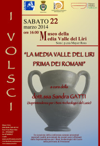 Sabato 22 marzo 2014, alle ore 16,00, presso la Sezione Archeologica del Museo si terrà la quinta conferenza dal titolo: “La Media Valle del Liri prima dei Romani: i Volsci”.