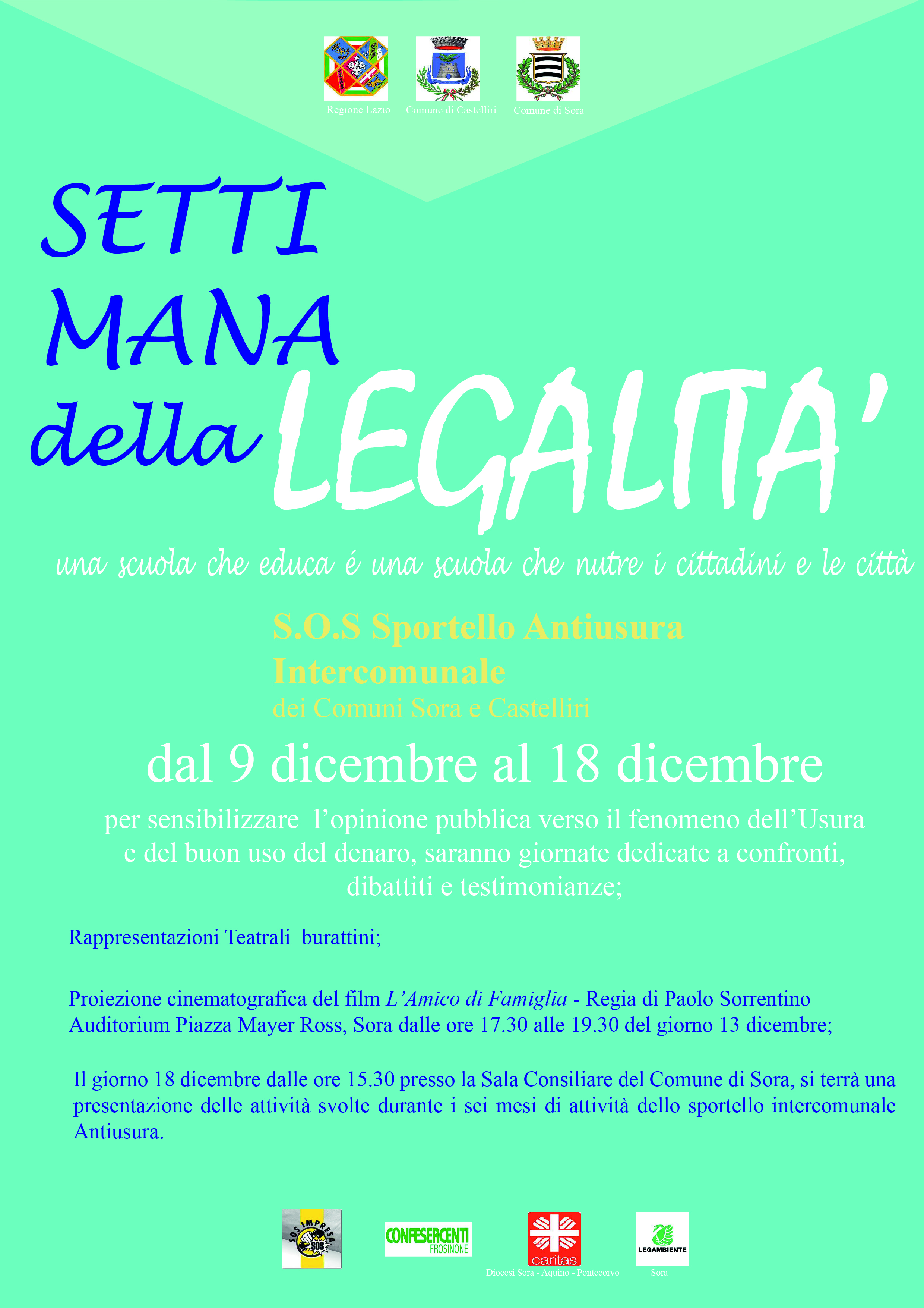 Lo sportello antiusura dei Comuni di Sora e Castelliri promuove “La Settimana della Legalità” programma di attività rivolto a famiglie e ragazzi per sensibilizzare, prevenire e combattere il fenomeno dell’usura, del sovra indebitamento e del buon uso del denaro. Gli operatori dello sportello antiusura gestito da Sos Impresa Confesercenti, con il supporto della Caritas Diocesana, del Circolo di Legambiente di Sora, visiteranno le scuole di ogni ordine e grado, andranno presso le associazioni del territorio per promuovere una cultura rispettosa delle regole del vivere in una comunità civile. Grazie alle amministrazioni dei Comuni di Sora e Castelliri e soprattutto alla Regione Lazio che ha finanziato lo sportello é stato possibile attuare questo progetto di educazione alla prevenzione e all’uso legale del denaro.