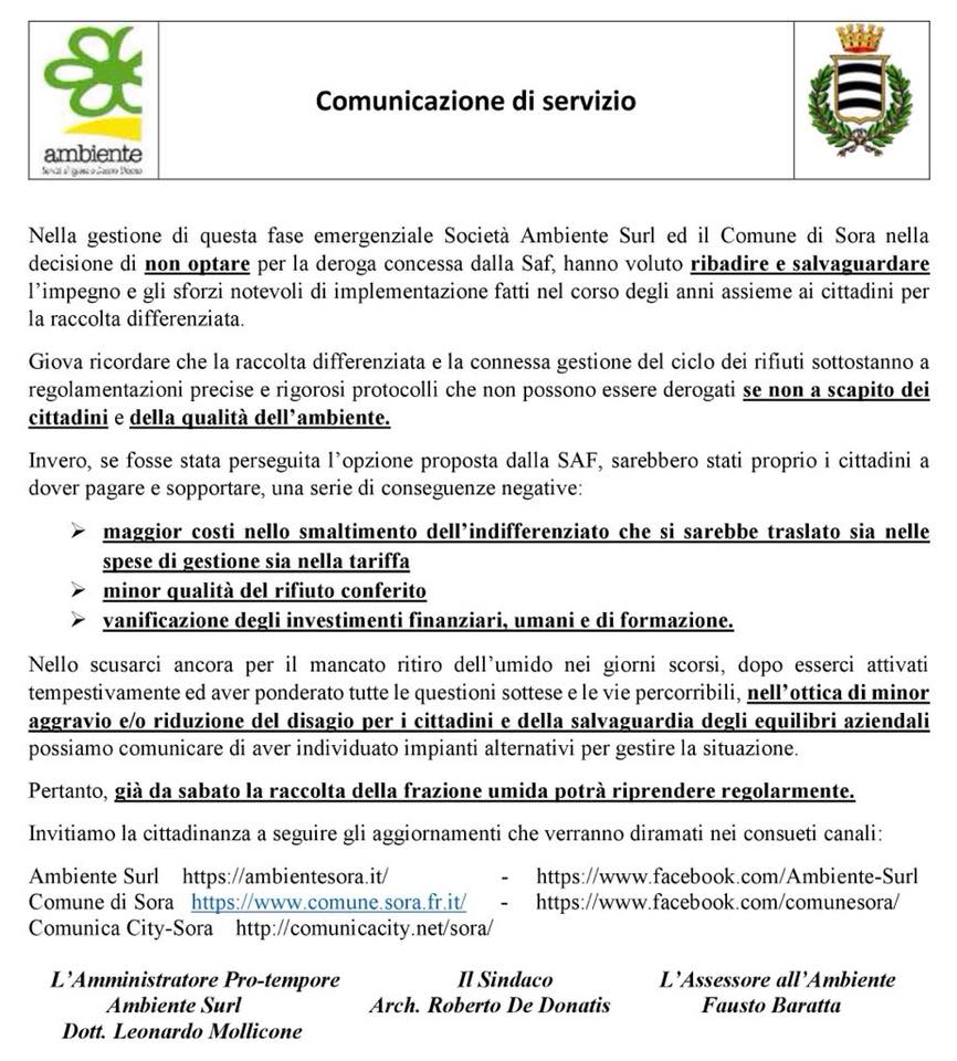 Da sabato 15 settembre, l’Ambiente surl, riprende regolarmente la raccolta dell’umido.