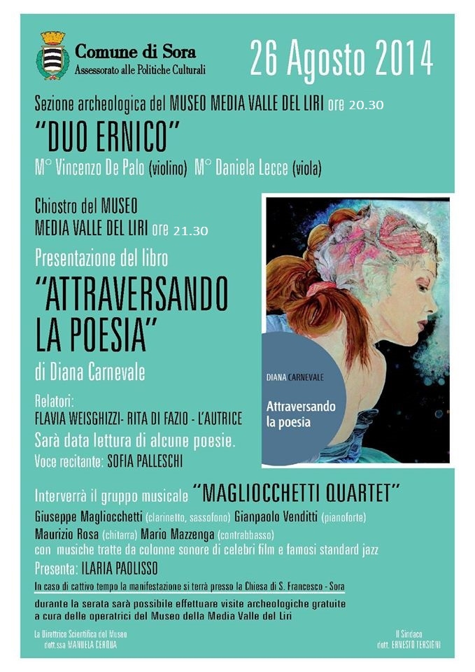 A seguire, alle ore 21.30, all’interno dello scenografico Chiostro del Museo, sarà presentato il libro “Attraversando la poesia” di Diana Carnevale. Ad illustrare l’opera sarà la stessa autrice affiancata da Flavia Weisghizzi e Rita Di Fazio. Sofia Palleschi reciterà alcune liriche contenute nel volume. Interverrà il gruppo musicale “Magliocchetti Quartet”: Giuseppe Magliocchetti (clarinetto, sassofono), Gianpaolo Venditti (pianoforte), Maurizio Rosa (chitarra) e Mario Mazzenga (contrabasso). La formazione musicale proporrà un particolare repertorio tratto da colonne sonore di celebri film e famosi standard jazz.