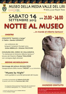 Ricco il programma della serata a lui dedicata, articolata in due momenti. Nel corso del primo, presso il chiostro del museo, si terrà la manifestazione di chiusura e consegna attestati del corso di calligrafia “In memoria di Alberto Santucci” tenuto dal maestro Franco Taglione, seguirà il concerto dei maestri Fabio e Sandro Gemmiti, la lettura di poesie del poeta Rodolfo Damiani recitate dalla voce di Francesca Bellino, per terminare con “Milongueando per la Historia”, esibizione dei campioni europei di tango 2013, Gioia Abballe e Simone Facchini. Nella seconda parte della rassegna, che si terrà nella sezione archeologica, verrà inaugurata la mostra del pittore Michele Rosa (14-29 settembre) che tornerà ad esporre a Sora dopo 10 anni di assenza. “Museo by night” chiuderà l’evento con visitite guidate a cura del personale del Museo e dell’Istituto “Einaudi”.