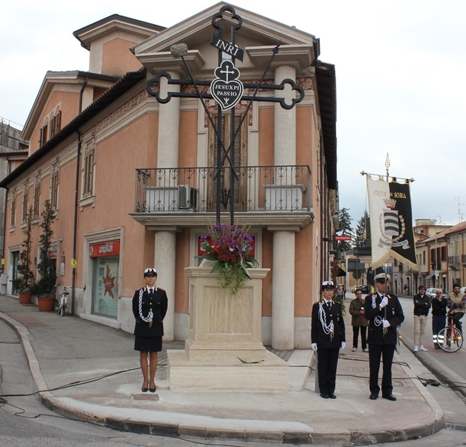 La cerimonia, promossa dall’Amministrazione Comunale, è stata aperta dall’intervento del Prof. Lucio Meglio, sociologo e docente dell’Università degli Studi di Cassino e del Lazio Meridionale, che ha effettuato uno studio sulle croci presenti in città. Il Prof. Meglio ha ripercorso la storia della Croce, dalle origini ad oggi. La Croce, in una prima versione lignea, fu posta dalla popolazione sorana a ricordo della missione dei Padri Passionisti presso la Parrocchia della Cattedrale SS. Maria Assunta, avvenuta alla fine del XIX secolo. Le missioni dei Passionisti iniziarono nelle varie parrocchie cittadine nel 1858, dopo che i Padri presero possesso del ritiro di Sora nel 1842. A ricordo di quest’opera di evangelizzazione numerose croci furono poste nella città, in particolare lungo le strade di accesso. Nel 1922 la Croce di Piazza Risorgimento venne rinnovata nell’attuale versione in ferro.