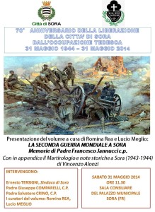 Presentazione Volume Lucio Meglio e Romina ReaIl Comune di Sora si prepara a celebrare il 70° Anniversario della Liberazione della Città dall’occupazione tedesca che cadrà sabato 31 maggio 2014.