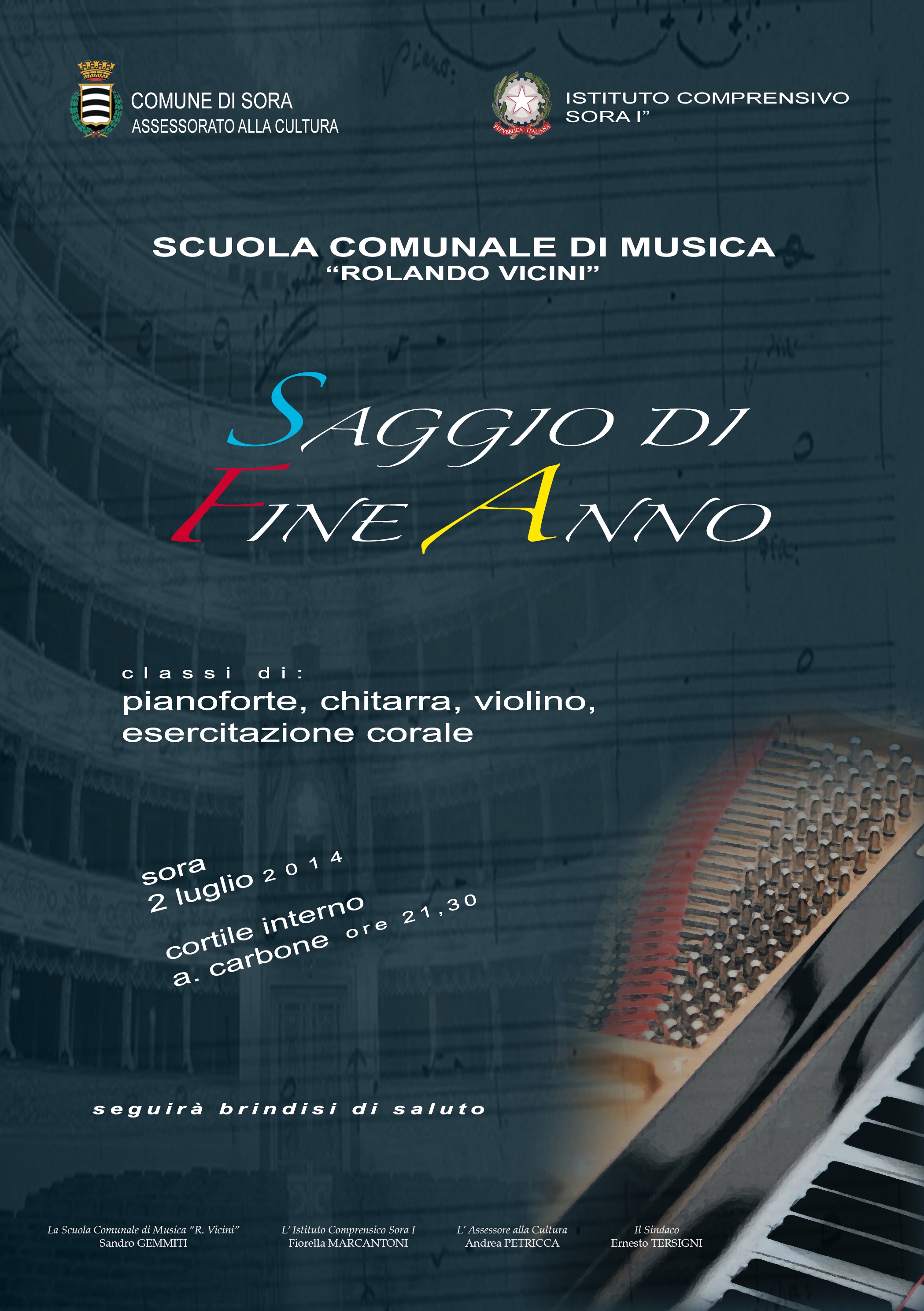 Mercoledì 2 luglio 2014, alle ore 21.30, si terrà il Saggio finale della Scuola Comunale di Musica “Rolando Vicini”, con sede a Sora. L’evento avrà luogo presso il cortile interno della Scuola “A. Carbone”. Si esibiranno le classi di pianoforte, chitarra, violino ed esercitazione corale.