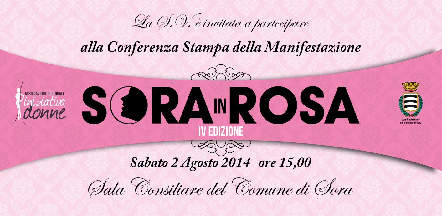 La Città Volsca è pronta ad accogliere la quarta imperdibile edizione dell’evento più rosa del calendario delle manifestazioni di ViviSora 2014: “SORA IN ROSA”. Danza, musica, prevenzione, moda, arte, divertimento, cultura, sport, poesia, animazione descriveranno le tante sfumature del mondo femminile: giovedì 7 e venerdì 8 agosto, presso il Chiostro del Museo della Media Valle del Liri, L’Arte incontrerà il Rosa e sabato 9 agosto in Corso Volsci, dalle ore 20.00, si animerà con una grande festa per tutti. L’Associazione Culturale No Profit “ Iniziativa Donne” di Sora, mossa dal desiderio di valorizzare la Città di Sora, è lieta di organizzare, anche quest’anno, un evento in grado di riscuotere sempre un grande successo di pubblico e critica.