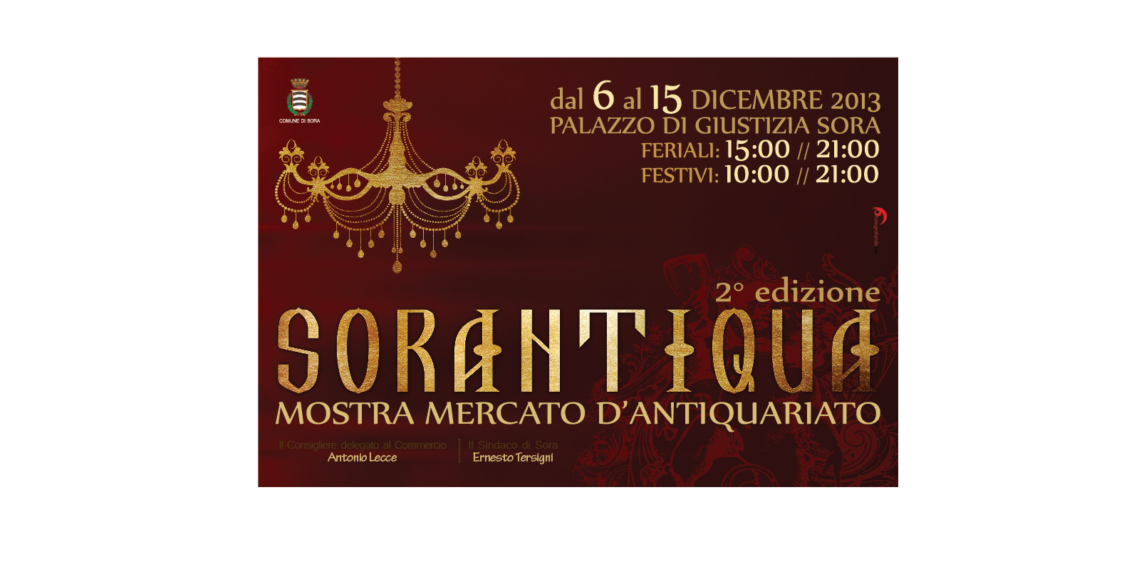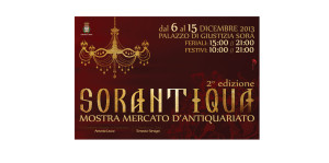 invito15x10Il valore storico ed il pregio artistico, l’eccellenza e l’eleganza di oggetti unici e preziosi. È questa “SORANTIQUA”, la seconda Mostra Mercato dell’Antiquariato che prenderà il via venerdì 6 dicembre 2013 a Sora. Fino al 15 dicembre il Palazzo di Giustizia, in Piazza Mayer Ross, proporrà al pubblico un affascinante viaggio tra eleganti stand espositivi a cura di 10 antiquari che giungeranno a Sora da tutto il Lazio e da altre regioni d’Italia. La rassegna, che rappresenta un evento originale ed innovativo per la provincia di Frosinone, sarà inaugurata venerdì 6 dicembre, alle ore 19,30, alla presenza delle autorità civili, militari e religiose. Ad accogliere i visitatori ricercata musica dal vivo ed un raffinato cocktail.
