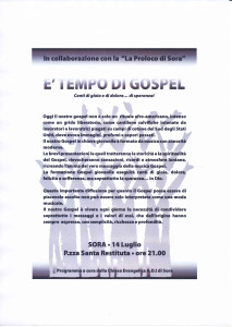 Il Gospel non è solo un rituale afro-americano, intenso come un grido liberatorio, come cantilene salvifiche intonate da lavoratori e lavoratrici piegati su campi di cotone del Sud degli Stati Uniti, dove evoca immagini, profumi e sapori passati. È vivere ogni giorno la necessità di condividere i messaggi e i valori che dall’origine questi canti hanno sempre espresso, con semplicità, ricchezza e profondità. Il Gospel in chiave giovanile è formato da musica con sonorità moderne. Nel corso del concerto le brevi presentazioni dei brani tratteranno la storicità e la spiritualità del Gospel, rievocheranno sensazioni, ricordi e atmosfere lontane, ricreando l’anima del vero messaggio di questa forma musicale.
