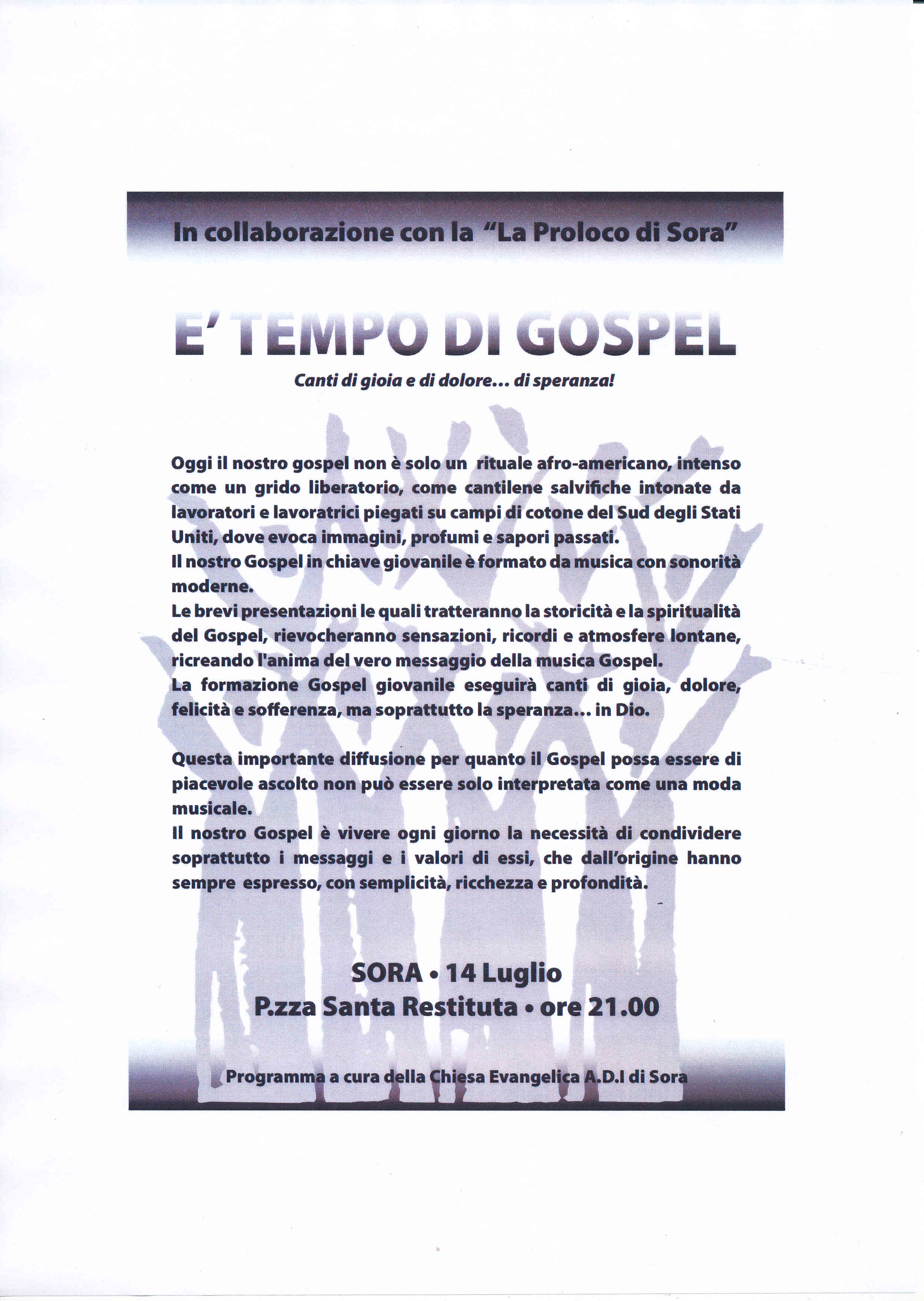 Alle ore 21.00, in Piazza Santa Restituta, è di scena il “E’ tempo di Gospel: Canti di gioia e di dolore…di speranza!”, un emozionante concerto a cura della Chiesa Evangelica A.D.I di Sora, in collaborazione con la Pro Loco.